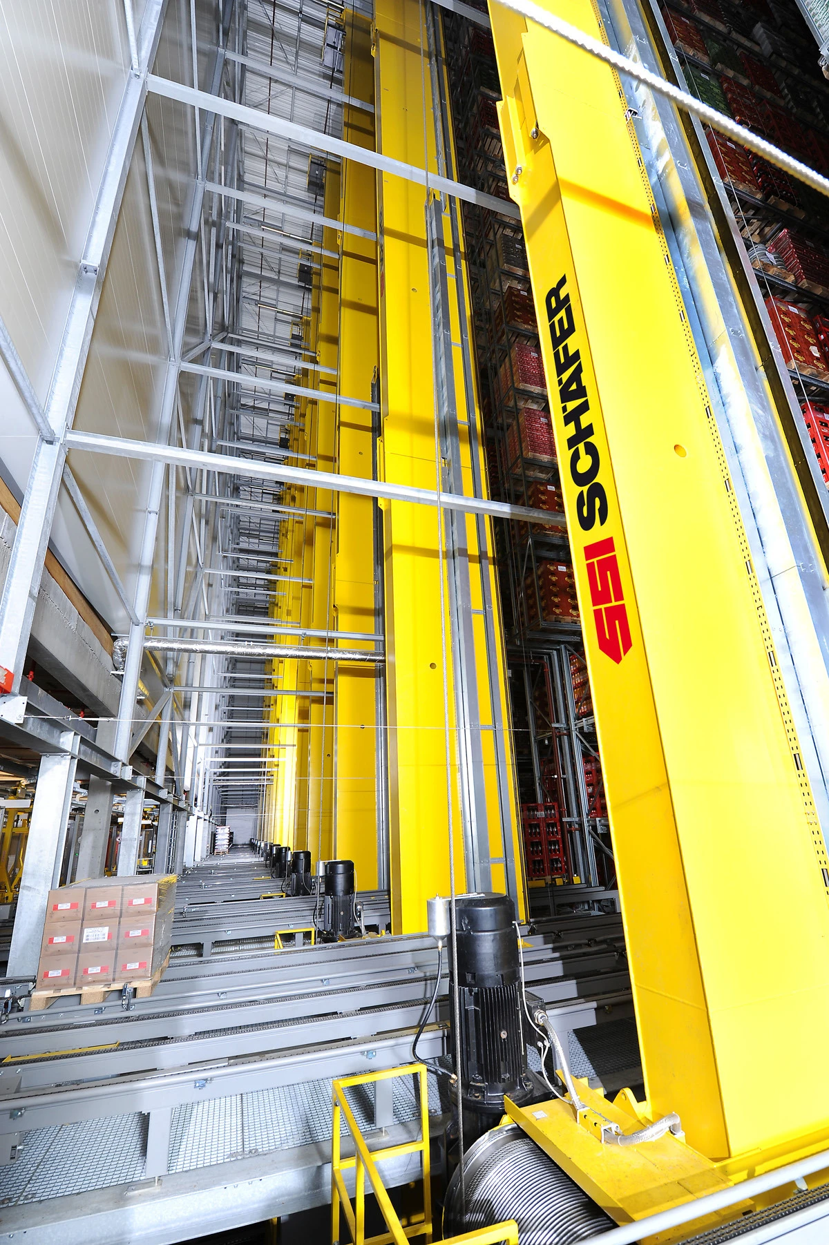 在9,000平方米的高儲位一體式倉儲內有18條通道包含70,000個飲料棧板儲存位置已準備送交出去,它們每一個設計儲位的最大重量高達1噸。 18個SRMs 配備每個有兩個伸縮的牙叉在此高揚層的一體式倉儲內的每小時處理能力最多700個棧板的儲存、800個出貨。