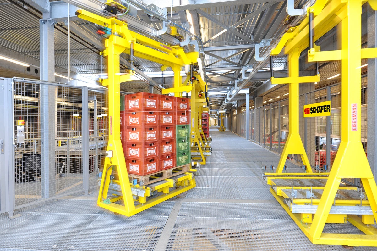 單軌循環輸送車將棧板運送至生產設備。生產設備是由一座單軌輸送車所使用的特殊橋連接到物流中心。 Schaefer使用一個位於倉庫旁邊彎區的軌道來克服在倉儲運輸水平與Carlsberg 生產區之間的垂直高度。在生產設施裡,棧板被堆高機自動化的取走與卸下。清理乾淨的瓶子和容器,經過破損檢查後就被轉送到裝瓶廠。